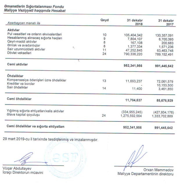 Ötən ili Fondun yığılmış sığorta ehtiyatları üzrə kəsiri azalıb (bağlanan banklara və digər xərclərə görə ehtiyatlar itirilib). 2017-ci ilin sonunda yığılmış sığorta ehtiyatları üzrə kəsir 472 milyon 934 min manat ikən, 2018-ci il ərzində 92 milyon 979 min manat azalaraq 334 milyon 955 min manata düşüb. Kəsir fondun 1 milyard 276 milyon manatlıq ödənilmiş kapitalı hesabına aradan qaldırılır.
