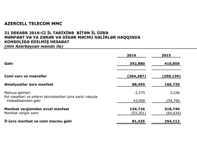 “Azercell Telekom” MMC 2016-cı ili 81 milyon 425 min manat xalis mənfəət ilə başa vurub. “Marja” xəbər verir ki, 2015-ci illə müqayisədə Azərbaycanın ən böyük mobil operatorunun xalis mənfəəti təxminən 3 dəfə azalıb. Azercell 2015-ci ildə 254 milyon 112 min manat xalis mənfəət əldə etmişdi.