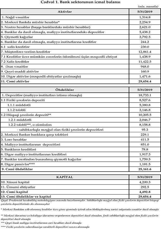 31 may 2019-cu il tarixinə Azərbaycanda fəaliyyət göstərən bankların cəmi aktivləri 29 milyard 654.4 milyon manat, cəmi öhdəlikləri isə 25 milyard 161.6 milyon manat təşkil edib. Sektorun balans kapitalı 4 milyard 492.8 milyon manat olub.