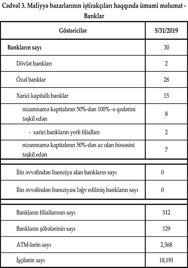 Fəaliyyət göstərən 30 bankın filiallarının sayı 512, şöbələrinin sayı 129, ATM-lərin sayı 2,568 olub. Bank sektorunun işçi heyətinin sayında artım may ayında da davam etmişdir. Belə ki, 2019-cu ilin may ayında işçi sayı 1.2% (209 nəfər) artaraq 18 min 191 nəfər təşkil edib.