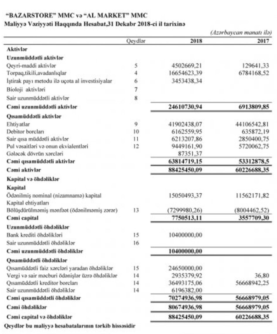 31 dekabr 2018-ci il tarixində “Bazarstore” MMC 88 milyon 425 min manat cəmi aktivlərə malik olub. MMC 2017-ci ilin sonunda 60 milyon 226 min manat cəmi aktivlərə malik idi.