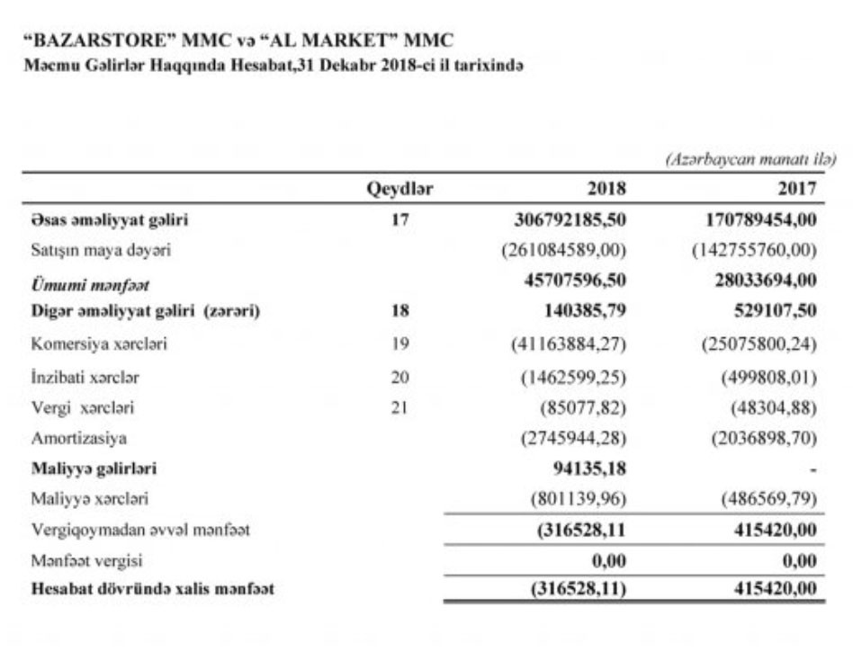 “Marja” “Bazarstore”un illik hesabatına istinadən xəbər verir ki, 2017-ci ildə təxminən 171 milyon manat təşkil etmiş əsas əməliyyat gəliri 2018-ci ildə təxminən 307 milyon manata yüksəlib (əsas əməliyyat gəliri 1,8 dəfə artıb). Müqayisə olunan dövrdə satışın maya dəyəri təxminən 143 milyon manatdan 261 milyon manata qalxıb (1,8 dəfə artım). “Bazarstore” ötən ili təxminən 46 milyon manat ümumi mənfəət əldə edib. 2017-ci ildə bu rəqəm 28 milyon manat idi.