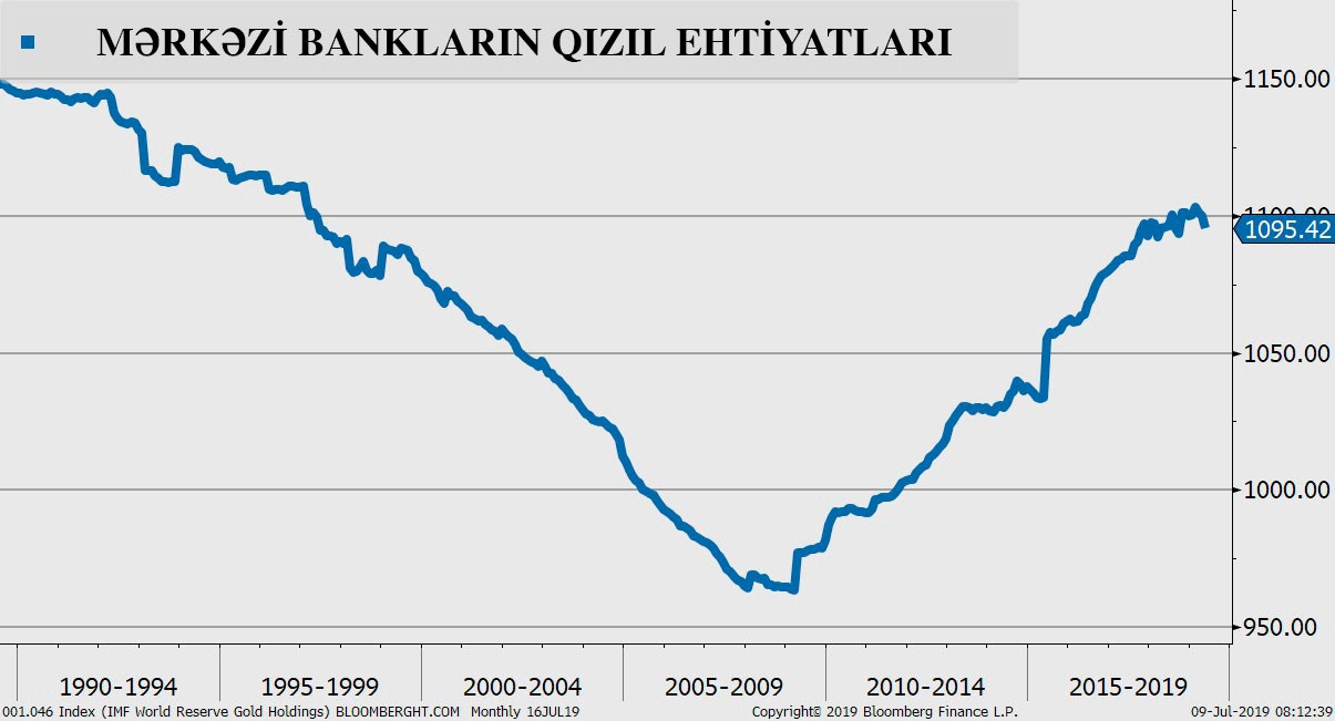 Mərkəzi banklar səngiyən qlobal iqtisadi artım, ticarət, geo-siyasi gərginliklər və ehtiyatları dollardan fərqli bir şəkildə şaxələndirmək istəmələrilə 2019-da qızıl ehtiyatlarını artırıblar.