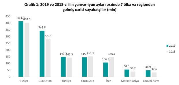 2019-cu ilin iyun ayında gələnlərin sayında əhəmiyyətli dərəcədə artım müşahidə olunub – bu artım 17.2% təşkil edib. Bu tendensiya özünü Azərbaycan turizmi üçün xarakterik olan bütün ölkələr üzrə göstərib.