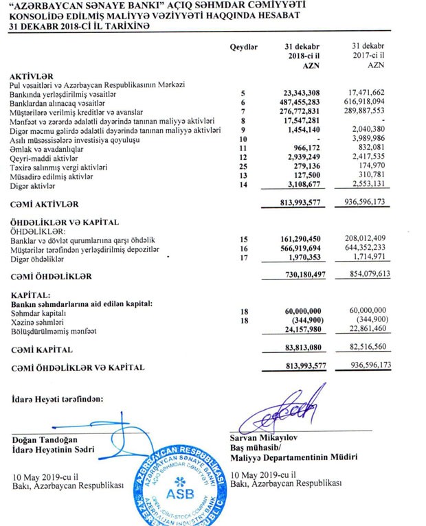 Qeyd edək ki, "Azərbaycan Sənaye Bankı" ASC 2018-ci ildə kiçilib. 2017-ci ilin sonunda 937 milyon manat təşkil etmiş cəmi aktivlər 2018-ci ilin sonunadək 815 milyon manata düşüb. Bankın müştərilərə verdiyi cəmi kreditlər 290 milyon manatdan 277 milyon manata geriləyib.