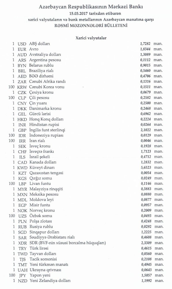 Martın 15-nə Mərkəzi Bankın açıqladığı rəsmi Dollar/manat məzənnəsi Martın 14-ü ilə müqayisədə düşərək 1,7282 manat olub, Avro/manat məzənnəsi isə 1.8344 manata endib.