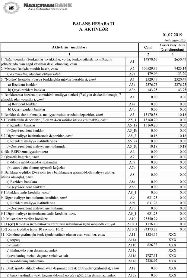 30 İyun 2019-cu il tarixində “Naxçıvanbank” ASC 215 milyon 763 min manat cəmi aktivlərə, 135 milyon 363 min manat cəmi öhdəliklərə və 80 milyon 400 min manat cəmi kapitala malik olub.