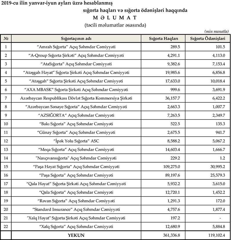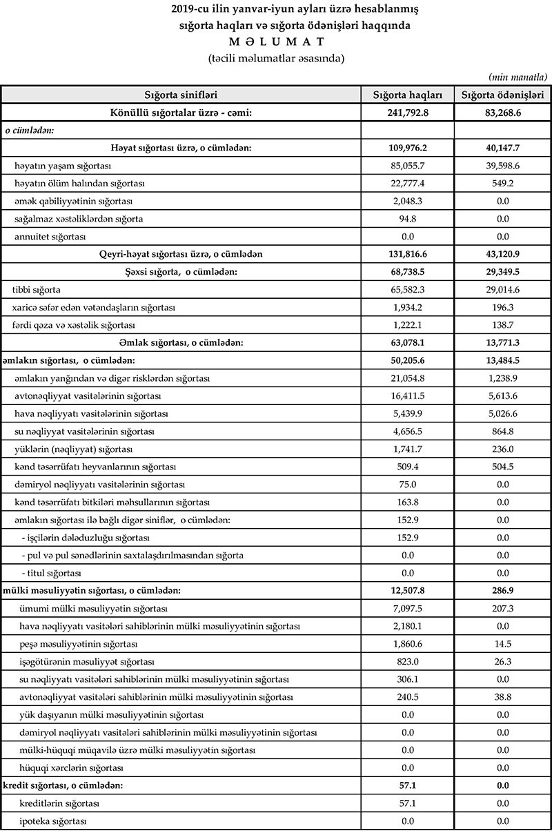 2019-cu ilin yanvar-iyun aylarında könüllü sığorta bazarı üzrə haqlar 241.8 mln. manat, ödənişlər isə 83.3 mln. manat təşkil edib. İcbari sığorta bazarı üzrə haqlar 119.5 mln. manat, ödənişlər isə 35.8 mln. manat olub.