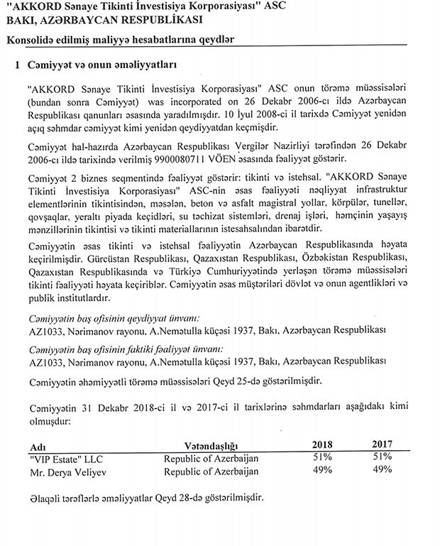 Qeyd edək ki, “Akkord Sənaye Tikinti İnvestisiya Korporasiyası” nın 51%-i "VİP Estate" şirkətinə, 49%i Dərya Vəliyevə məxsusdur. Həmçinin Dərya Vəliyev şirkətin Müşahidə Şurasının sədridir.