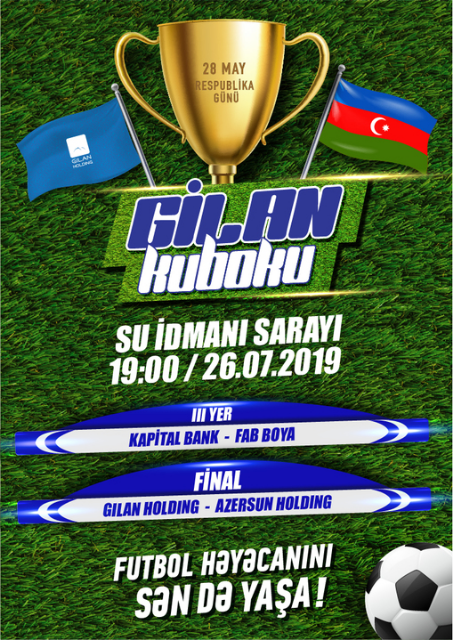 Sabah, 26 iyul 2019-cu il tarixində Su İdmanı Sarayının mini futbol meydançasında “Gilan Kuboku” çempionatında birinci yer uğrunda qarşılaşma “Gilan Holdinq” və "Azərsun Holdinq" komandaları arasında baş tutacaq. Turnirə böyük həvəslə qatılan, iddialı və güclü oyun nümayiş etdirən “FAB Boya” və “Kapital Bank” komandaları öz aralarında 3-cü yerə sahib olacaq komandanı müəyyən edəcəklər.