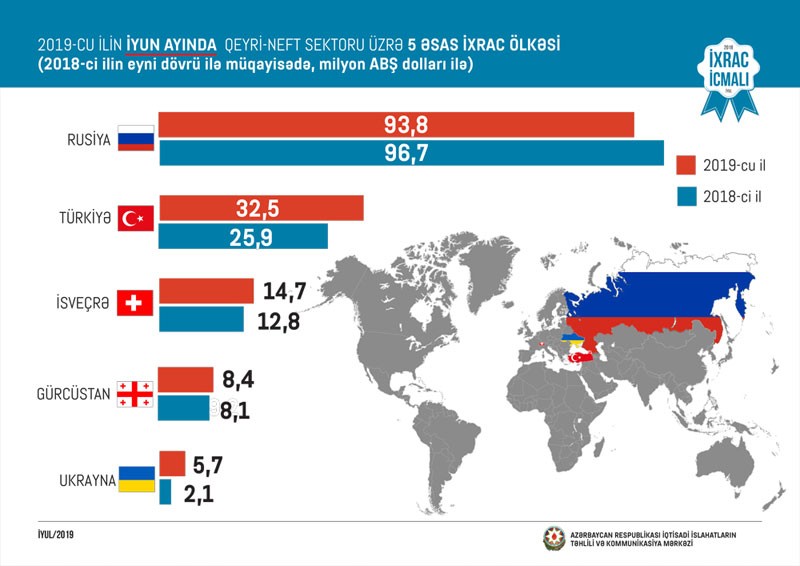 2019-cu ilin iyun ayında isə qeyri-neft sektoru üzrə ixrac 192 milyon ABŞ dolları təşkil edib. Ötən ilin iyun ayı ilə müqayisədə 2019-cu ilin iyun ayında qeyri-neft sektoru üzrə ixrac 13 milyon ABŞ dolları və ya 7 faiz artıb. Cari ilin iyun ayında qeyri-neft sektoruna aid ən çox mal Rusiyaya (93,8 milyon ABŞ dolları), Türkiyəyə (32,5 milyon ABŞ dolları), İsveçrəyə (14,7 milyon ABŞ dolları) Gürcüstana (8,4 milyon ABŞ dolları) və Ukraynaya (5,7 milyon ABŞ dolları) ixrac edilib.
