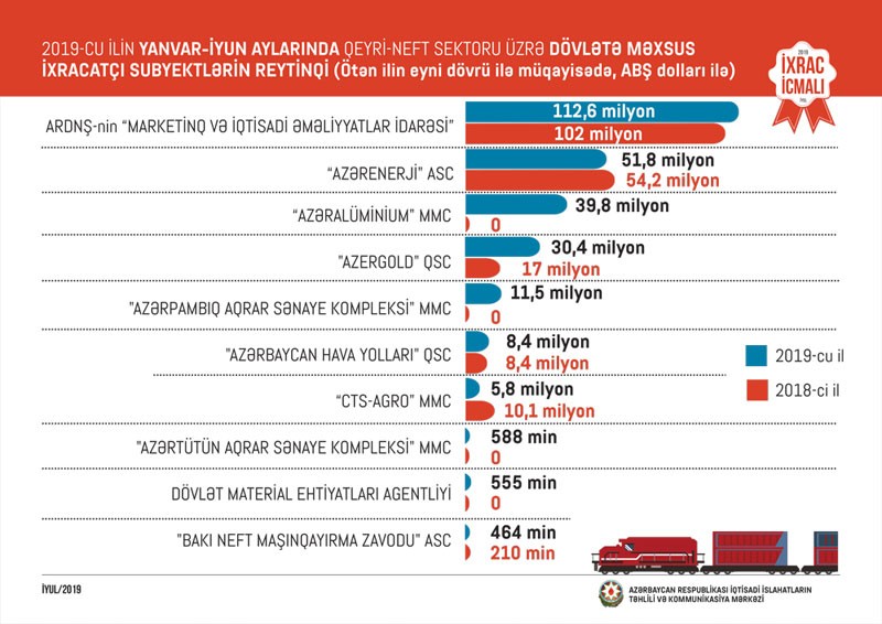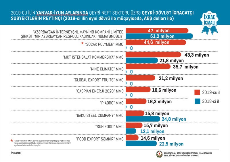 Bu ilin yanvar-iyun ayları üzrə hazırlanan qeyri-dövlət ixracatçı subyektlərin reytinqində ilk onluqda aşağıdakı şirkətlər təmsil olunurlar: "Azərbaycan İnterneyşnl Mayninq Kompani Limited Şirkəti"nin Azərbaycan Respublikasındakı nümayəndəliyi, “Socar Polymer” MMC, "MKT İstehsalat Kommersiya" MMC, "Nine Climate" MMC, "Global Export Fruits" MMC, "Caspian enerji-2020" MMC, "P-Aqro" MMC, "Baku Steel Company", “Sun Food" MMC, "Food Export Şəmkir" MMC. Cari ilin iyun ayında "Azərbaycan İnterneyşnl Mayninq Kompani Limited Şirkəti"nin Azərbaycan Respublikasındakı nümayəndəliyi bu siyahıda liderliyi ələ alıb.