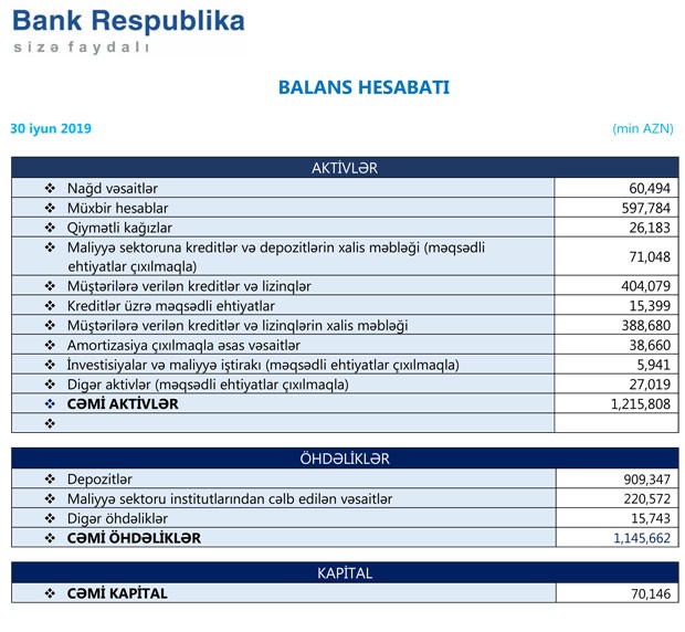 "Bank Respublika" 2019-cu ilin birinci yarımilliyinə dair maliyyə hesabatlarını açıqlayıb.
