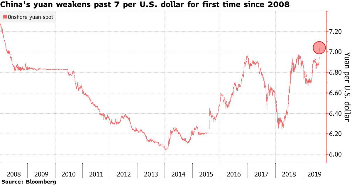 Çin Mərkəzi Bankı PBOC, ABŞ-ın Çin mallarına əlavə gömrük tarifi qərarları ilə əlaqədar olaraq pul vahidini (yuan) stabil saxlaya bilmək üçün qısamüddətli sərt tədbirlər görməyə hazır olduğunu açıqlayaraq, yuanın dollar qarşısında 2008-ci ildən bu yana ilk dəfə 7 səviyyəsinin üzərində olduğunu qeyd edib.