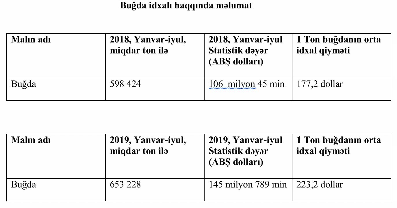 2018-ci ilin 7 ayı ərzində xaricdən Azərbaycana 106 milyon 45 min dollar dəyərində 598 min 424 min ton buğda idxal edilmişdi.