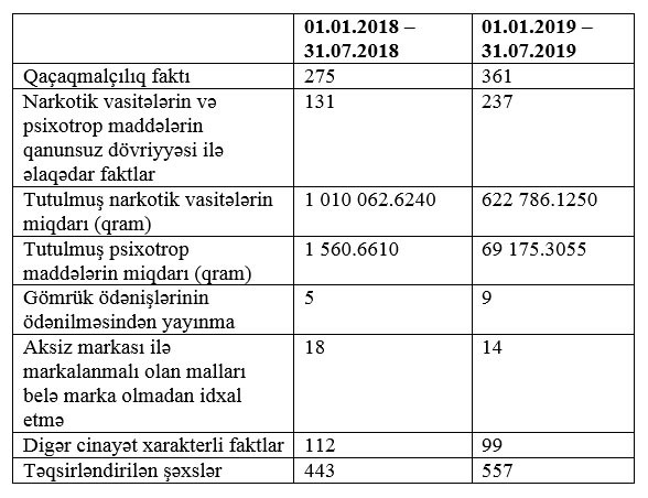 “Marja” Dövlət Gömrük Komitəsinin aylıq statistikasına istinadən xəbər verir ki, 2019-cu ilin 7 ayı ərzində 361 qaçaqmalçılıq faktı qeydə alınıb. Ötən ilin eyni dövründə bu say 275 idi.