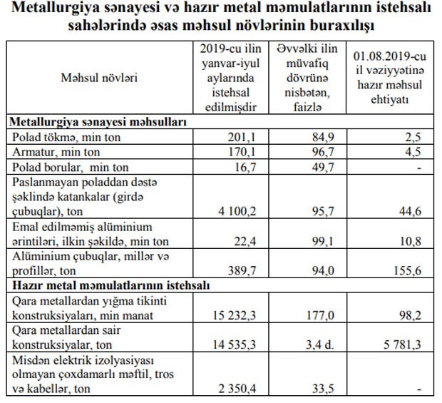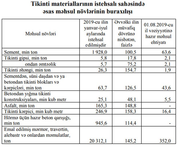 2019-cu ilin yanvar-iyul aylarında tikinti materiallarının istehsalı sahəsində fəaliyyət göstərən müəssisələr tərəfindən istehsal edilmiş məhsulun ümumi dəyəri 7,8 faiz artaraq 460,5 milyon manat təşkil etmişdir. Tikinti kərpicinin istehsalı 58,3 faiz, tikinti əhənginin istehsalı 54,7 faiz, hörmə üçün hazır beton qarışığının istehsalı 14,4 faiz, sementin istehsalı 0,5 faiz artmış, betondan yığma tikinti konstruksiyalarının istehsalı 51,9 faiz, tikinti gipsinin istehsalı 82,2 faiz azalmışdır.