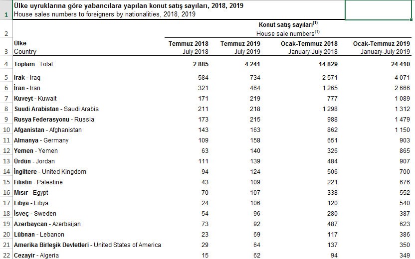 2019-cu ilin Yanvar-İyul dövründə (7 ayda) isə azərbaycanlılar Türkiyədə 623 mənzil alıblar (orta hesabla hər gün 3 mənzil). 2018-ci ilin eyni dövründə bu say 487 idi.