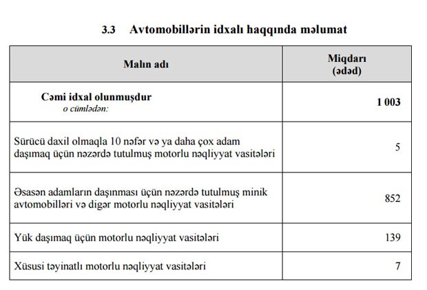 2017-ci ilin Yanvar-Fevral aylarında Azərbaycana 1 003 ədəd avtomobil (nəqliyyat vasitəsi) gətirilib.