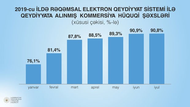 Bu ilin 7 ayında Azərbaycanda 7.116 yerli investisiyalı məhdud məsuliyyətli cəmiyyət qeydiyyata alınıb və onlardan 6.167-si elektron qeydiyyat xidmətindən istifadə ediblər. Hesabat dövründə elektron qeydiyyatdan keçənlərin xüsusi çəkisi artaraq 86,7 faizə yüksəlib.