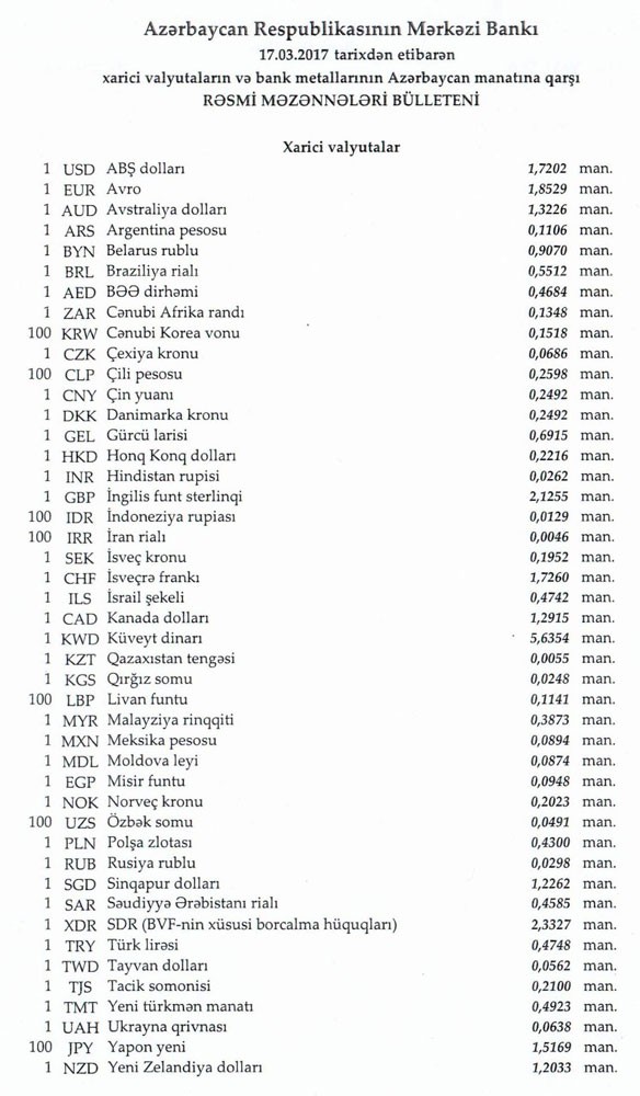 Martın 17-nə Mərkəzi Bankın açıqladığı rəsmi Dollar/manat məzənnəsi Martın 16-ı ilə müqayisədə düşərək 1,7202 manatda olub, Avro/manat məzənnəsi isə 1.8529 manata düşüb.