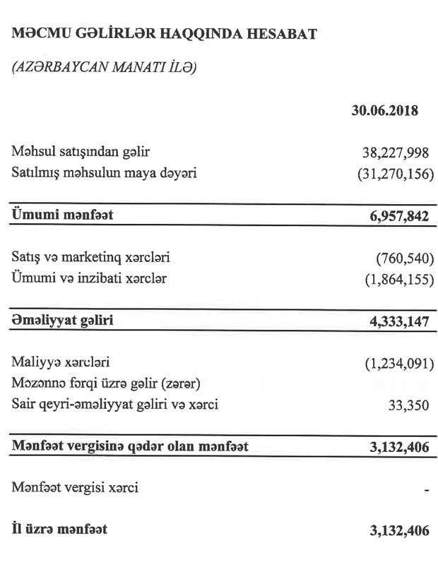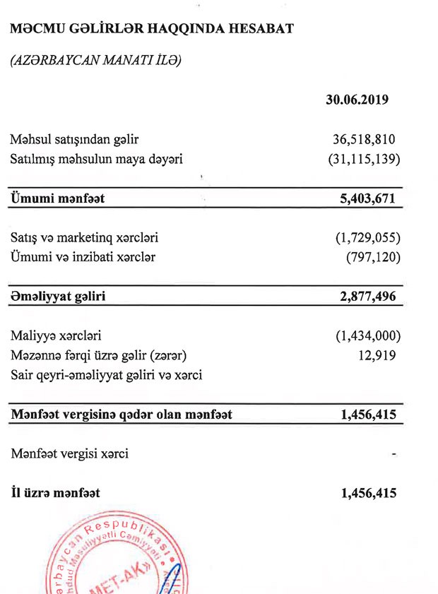 Müqayisə üçün qeyd edək ki, 2018-ci ilin yanvar-iyun dövründə "METAK"ın cəmi gəlirləri 38 milyon 261 min manat, cəmi xərcləri 35 milyon 129 min manat təşkil etmişdi. Nəticədə, “METAK” 3 milyon 132 min manat mənfəət əldə etmişdi. Şirkət cari ilin birinci yarısında da mənfəət vergisi ödəməmişdi.