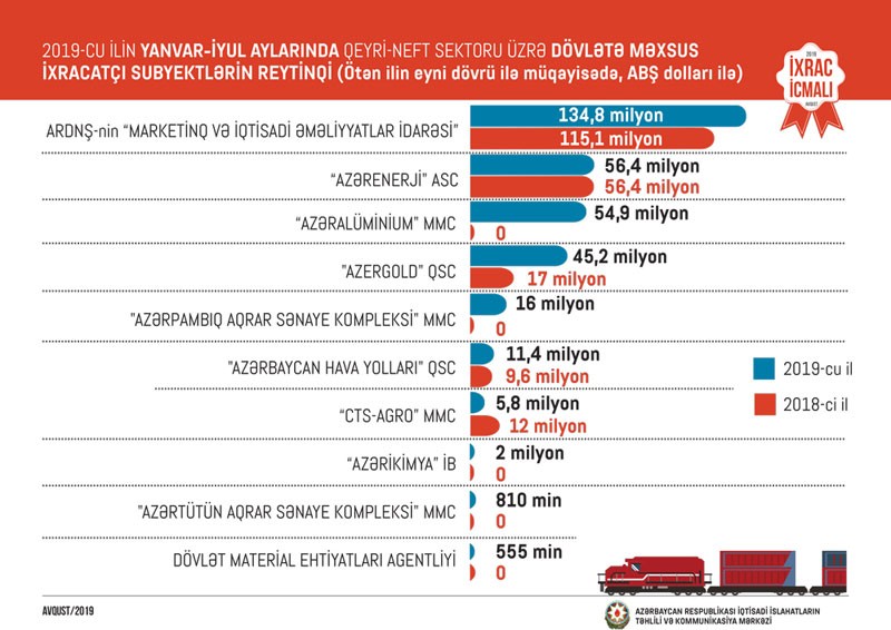 Bu ilin yanvar-iyul ayları qeyri-neft sektoru üzrə ixrac əməliyyatlarında iştirak edən dövlətə məxsus şirkətlərin siyahısına isə ARDNŞ-nin “Marketinq və İqtisadi Əməliyyatlar İdarəsi” başçılıq edir. Daha sonra bu siyahıda aşağıdakı şirkətlər təmsil olunurlar: "Azərenerji" ATSC, "Azəralüminium" MMC, "Azergold" QSC, "Azərpambıq Aqrar Sənaye Kompleksi" MMC, "Azərbaycan Hava Yolları" QSC, “CTS-Agro” MMC, "Azərikimya" İB, "Azərtütün Aqrar Sənaye Kompleksi" MMC, Dövlət Material Ehtiyatlari Agentliyi.