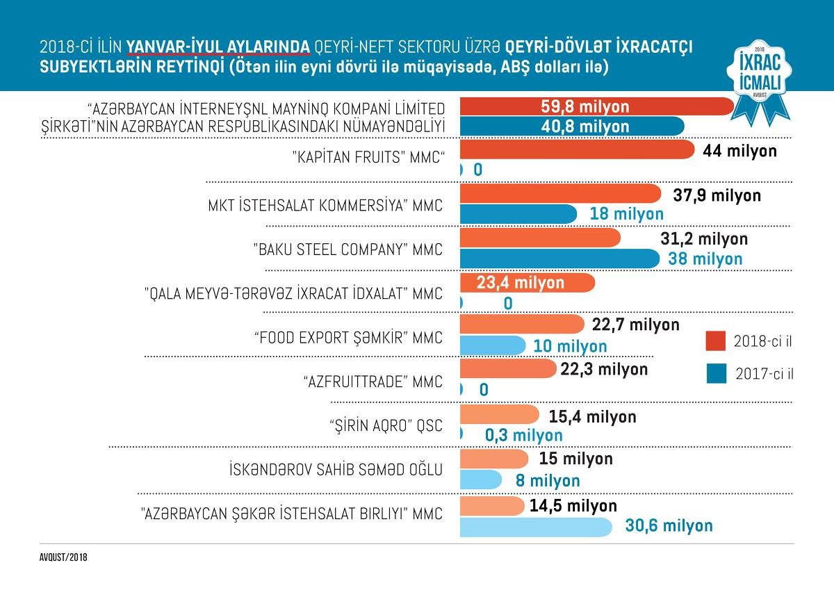 Müqayisə üçün qeyd edək ki, 2018-ci ilin yanvar-iyul aylarında qeyri-neft sektoru üzrə qeyri-dövlət ixracatçı subyektlərin siyahısında ilk onluqda “Azərbaycan İnterneyşnl Mayninq Kompani Limited Şirkəti”nin Azərbaycan Respublikasındakı nümayəndəliyi, "Kapitan Fruits" MMC, "MKT İstehsalat Kommersiya" MMC, "Baku Steel Company" MMC, "Qala meyvə-tərəvəz ixracat idxalat" MMC, “Food Export Şəmkir” MMC, “Azfruittrade” MMC, “Şirin Aqro” QSC, İskəndərov Sahib Səməd oğlu, "Azərbaycan Şəkər İstehsalat Birliyi" MMC təmsil olunurdu.