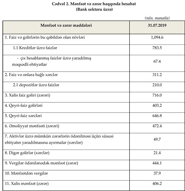 Maliyyə Bazarlarına Nəzarət Palatasının açıqladığı məlumata görə, 2019-cu ilin 7 ayı ərzində bankların əməliyyat mənfəəti 472.4 milyon manat, xalis mənfəəti isə 406.2 milyon manat təşkil edib.