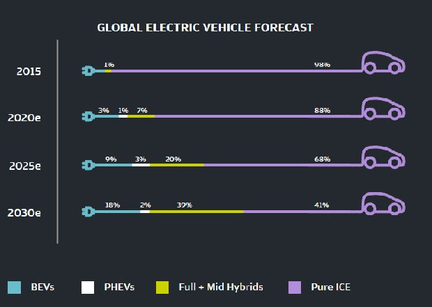Məsələn, JP Morgan Chase şirkətinin 2018-ci ilin Oktyabr ayında yayımladığı “Driving into 2025: The future of Electric Vehicle” hesabatında EV (Tam elektrik avtomobili) və HEV (Hibrid elektrik avtomobili) avtomobillərinə olan tələbin daha da yüksələcəyi və 2025-ci ildə qlobal bazarın 30%-ni təşkil edəcəyi bildirilirdi. Müqaisə üçün deyək ki, hələ 2016-cı ildə 1 milyon və ya dünya avtomobil parkının 1%-ni məhz PEV (Plug in elektrik avtomobili, bunlara BEV və PHV də daxildir) avtomobillləri təşkil edirdi. 2025-ci ildə bu göstəricilərin 8.4 milyon və ya dünya avtomobil parkının 7.7% olacağı proqnozlaşdırılır. Həmin tərixə qədər bazarın 70%-ni təşkil edəcək daxili yanma mühərrikli avtomobillərin payı 2030-cu ildə 40%-ə qədər azalacaq.