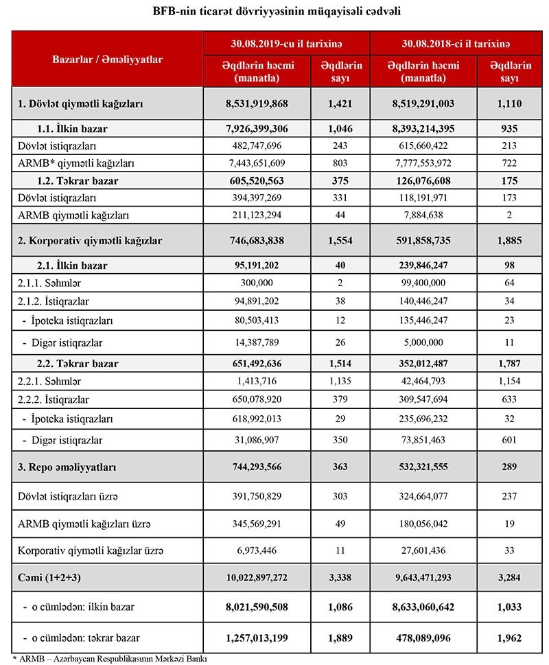 Təkrar bazarda isə dövlət istiqrazları ilə ticarətin həcmi 3,3 dəfə artaraq 394 milyon 397 min manat təşkil edib.