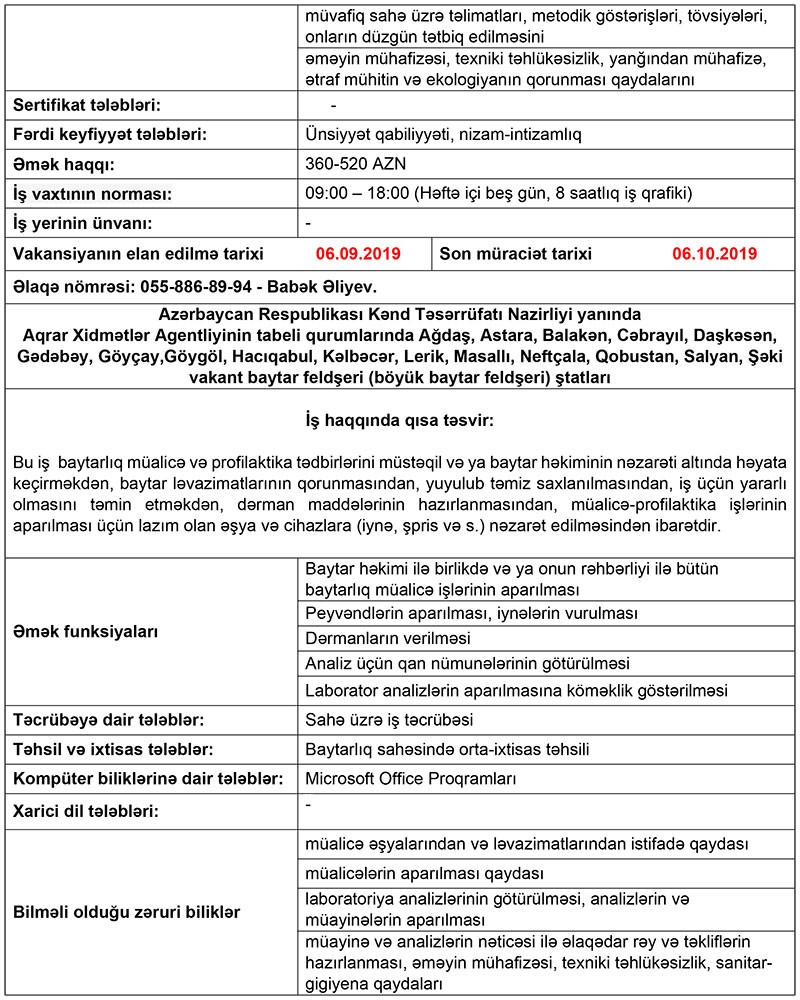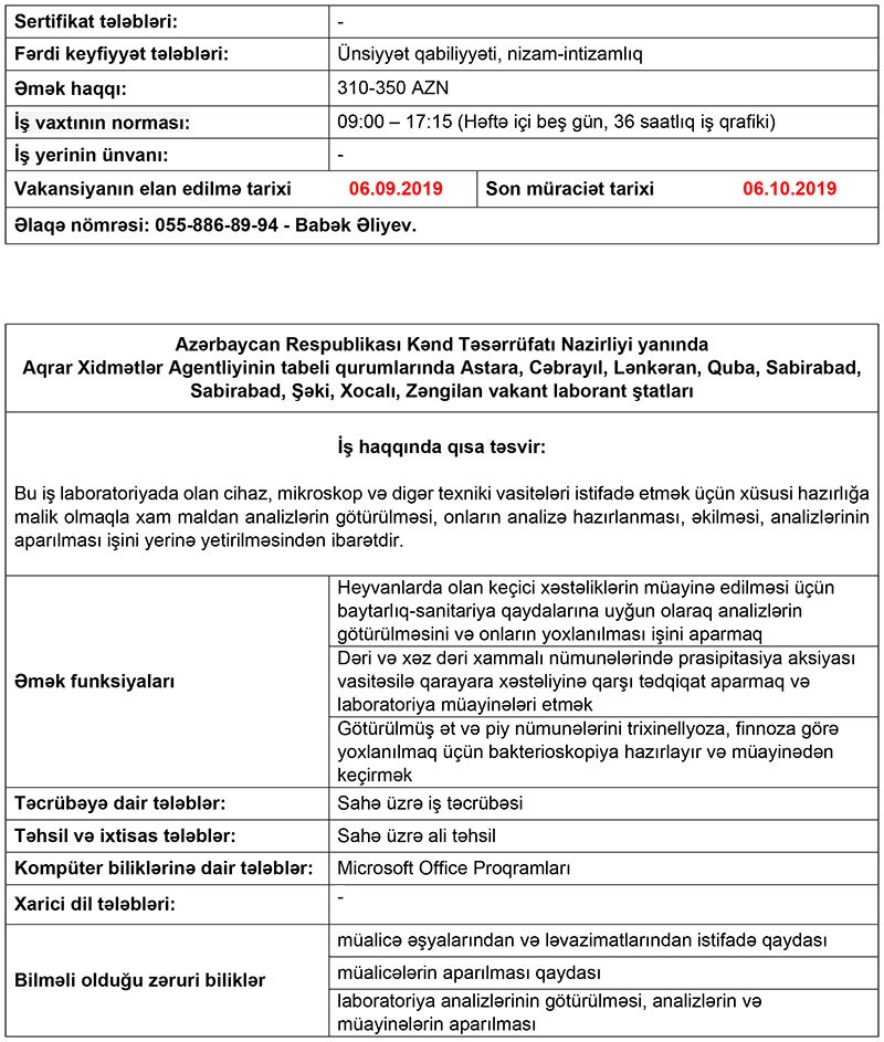Elana əsasən, nazirlik tərəfindən aqronom, baytar həkimi, baytar feldşeri, laborant və traktorçular vakant yerlər üzrə işə qəbul ediləcəklər.