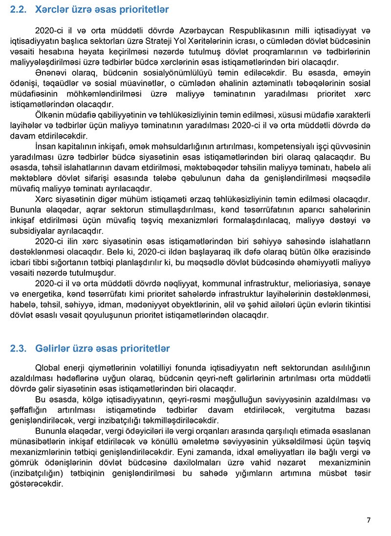 Büdcə xərclərinin tərkibində sosialyönlü xərclərin xüsusi çəkisi 40,7 faiz təşkil edəcəkdir ki, bu da 2019-cu illə müqayisədə 9,9 faiz-bəndi və ya 2 milyard 664,2 milyon manat çoxdur.