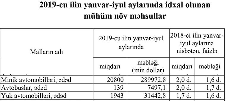 2019-cu ilin yanvar-iyul aylarında Azərbaycana 289 milyon 973 min dollar dəyərində 20 min 800 ədəd avtomobil, 31 milyon 443 min dollar dəyərində 1943 ədəd yük avtomobili, 7 milyon 497,1 min dollar dəyərində isə 139 avtobus idxal edilib.