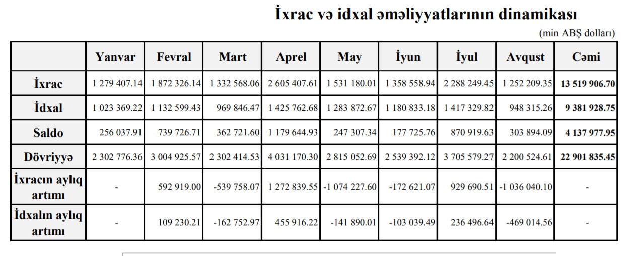 Avqustda ixrac 1 milyard 252 milyon 209 min dollar, idxal 948 min dollar, saldo müsbət 303 milyon 894 min dollar təşkil edib. İyulda ixrac 2 milyard 288 milyon 249 min dollar, idxal isə 1 milyard 417 milyon 329 min dollar təşkil etmişdi. Beləliklə, iyul ayı ilə müqayisədə Avqustda Azərbaycanın ixracı və idxalı azalıb.