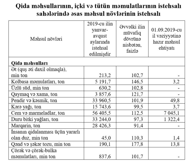 Hesabatda qeyd edilib ki, bu sahələrin əsas məhsullarından qənd və şəkər tozu istehsalı 77,8 faiz, kolbasa məmulatları 46,5 faiz, qaymaq və xama istehsalı 21,7 faiz, cem və marmeladların istehsalı 12,5 faiz, üzlü süd istehsalı 2,8 faiz, alkoqolsuz içkilərin istehsalı 15,5 faiz artıb.