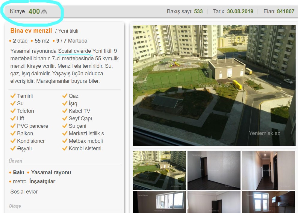 "Yeniemlak" saytında yerləşdirilmiş elanlardan birində qeyd olunur ki,Yasamal rayonunda Sosial evlərdə 9 mərtəbəli binanın 7-ci mərtəbəsində 55 kv.m-lik mənzil 400 manata kirayəyə verilir. Mənzil əla təmirlidir. Su, qaz, işıq daimidir.