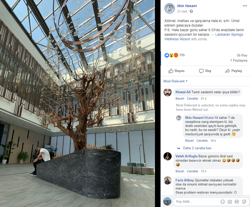 “İlkin bəyi oteldə iki dəfə görmüşəm. Hətta salamlaşmışıq da... Ondan soruşdum, söylədim ki, istirahət necədir? Cavab verdi ki, hər şey yaxşıdır, əladır. Şikayətini kaş ki, mənə desəydi. Sosial mediada işıqlandırmamışdan əvvəl bizim işçilərə üz tutardı. Bəlkə o zaman biz İlkin Həsəniyə köməklik göstərəcəkdik. Onunla danışan zaman hər şeyin gözəl olduğunu dedi. Mən yenə də maraqlanaram, çalışıram ki, İlkin bəyin özü ilə əlaqə saxlayım”.