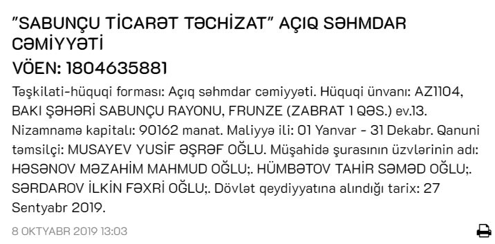 Yeni şirkətin hüquqi ünvanı Bakı şəhəri, Sabunçu rayonu, 1-ci Zabrat qəsəbəsi, ev 13, nizamnamə kapitalı 90 162 manat, qanuni təmsilçisi isə Yusif Əşrəf oğlu Musayevdir.