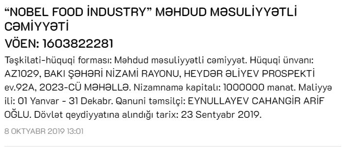 23 Sentyabr 2019-cu il tarixində Vergilər Nazirliyi "Nobel Food İndustry" MMC-ni dövlət qeydiyyatına alıb.