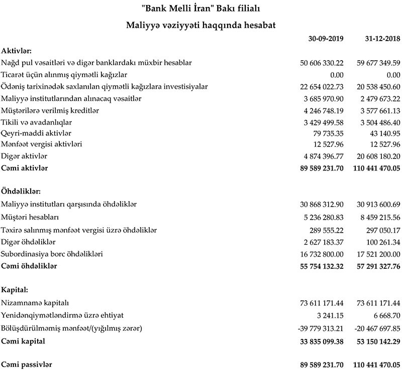 "Bank Melli İran" Bakı filialı 2019-cu ilin 9 ayını (yanvar-sentyabr dövrünü) 19 milyon 315 min manat zərər ilə başa vurub. 3-cü rübdə (iyul-sentyabr) Bankın zərəri 2 milyon 400 min manat da artıb. Filial cari ilin 6 ayını 16 milyon 905 min manat zərər ilə bağlamışdı.