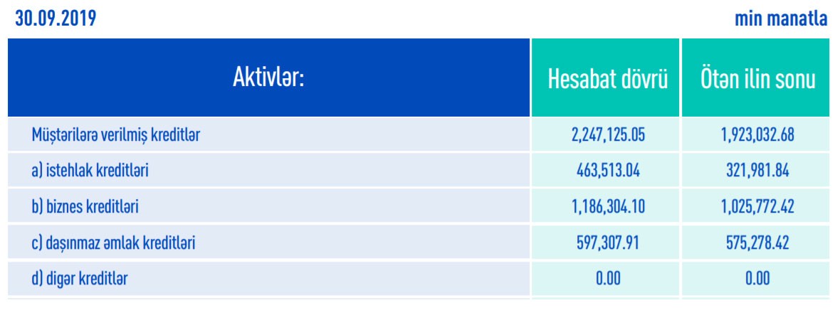 Müştərilərə verilmiş kreditlərin 1 milyard 186 milyon 304 min manatını biznes kreditləri, 463 milyon 513 min manatını istehlak kreditləri, 597 milyon 308 min manatını daşınmaz əmlak kreditləri (əsasən ipoteka kreditləri) təşkil edib.
