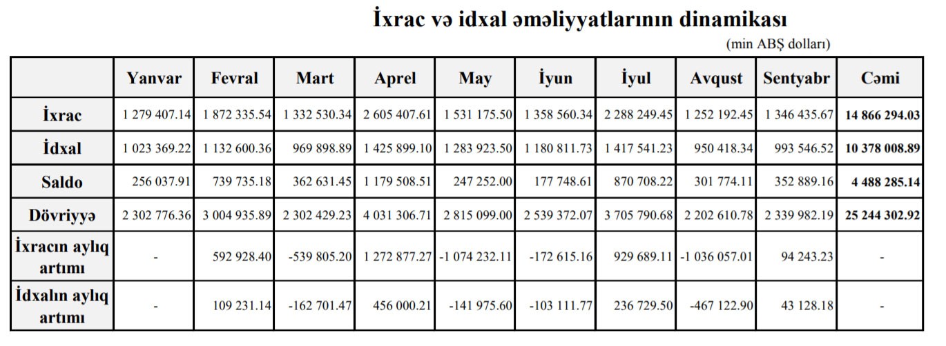 Sentyabrda ixrac 1 milyard 346 milyon 435 min dollar, idxal isə 993 milyon 546 min dollar olub. Avqustda ixrac 1 milyard 252 milyon 192 min dollar, idxal isə 950 milyon 418 min dollar təşkil etmişdi.