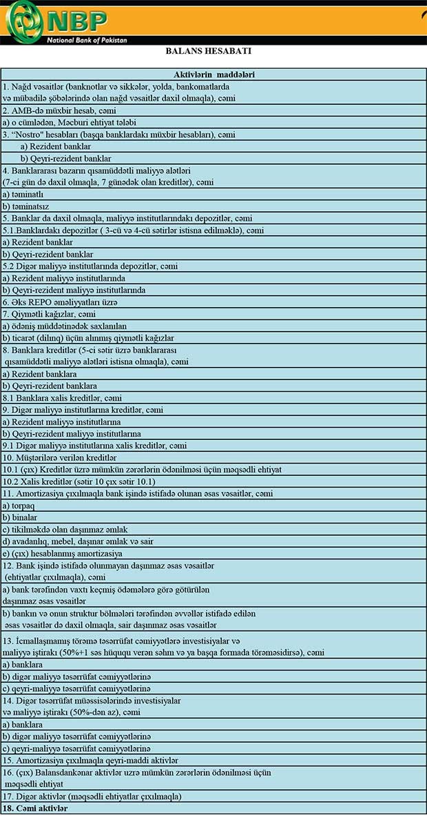 30 Sentyabr 2019-cu il tarixində Pakistan Milli Bankının Bakı filialı 10 milyon 425 min manat cəmi aktivlərə malik olub.