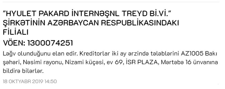 "Hewlett Packard International Trade Bi.Vi.". şirkəti Azərbaycandakı fəaliyyətini dayandırdığını elan edib.