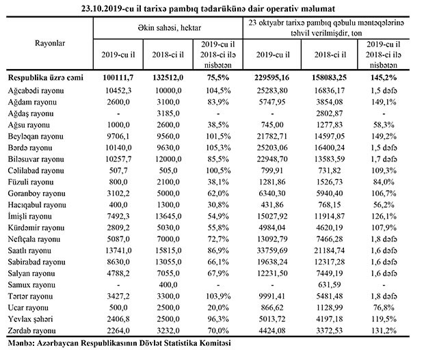 Dövlət Statistika Komitəsindən bildiriblər ki, bu, ötən ilin eyni dövrü ilə müqayisədə 45,2 faiz çoxdur. Keçən il oktyabrın 23-dək 158 min 83 ton pambıq tədarük olunmuşdu.