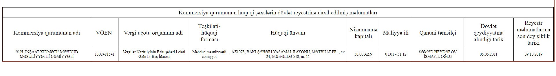 Vergilər Nazirliyi "S.H. İnşaat Xidməti" MMC-ni 05 May 2011-ci il tarixində dövlət qeydiyyatına alıb. 50 manat nizamnamə kapitalı olan şirkətin direktoru Heydərov Səməd İsmayıl oğludur.