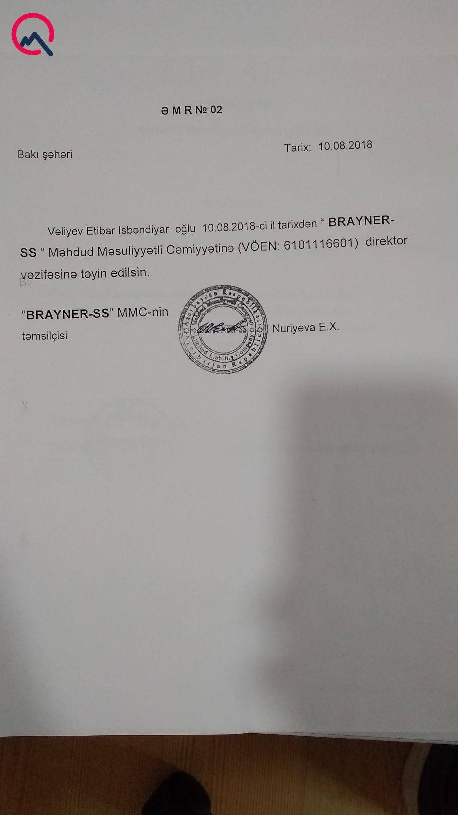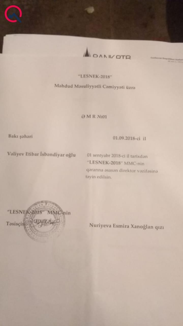 Şikayətçinin bizə təqdim etdiyi sənədlərdən görünür ki, onun adına açılan “Buttolo”, “Ceyson-TT”, “Dikson-N.N”, “Brayner – S.S”, “Lesnek-2018” şirkətinin hər birinə Vəliyev Etibar İsbəndiyar oğlu direktor təyin olunub.