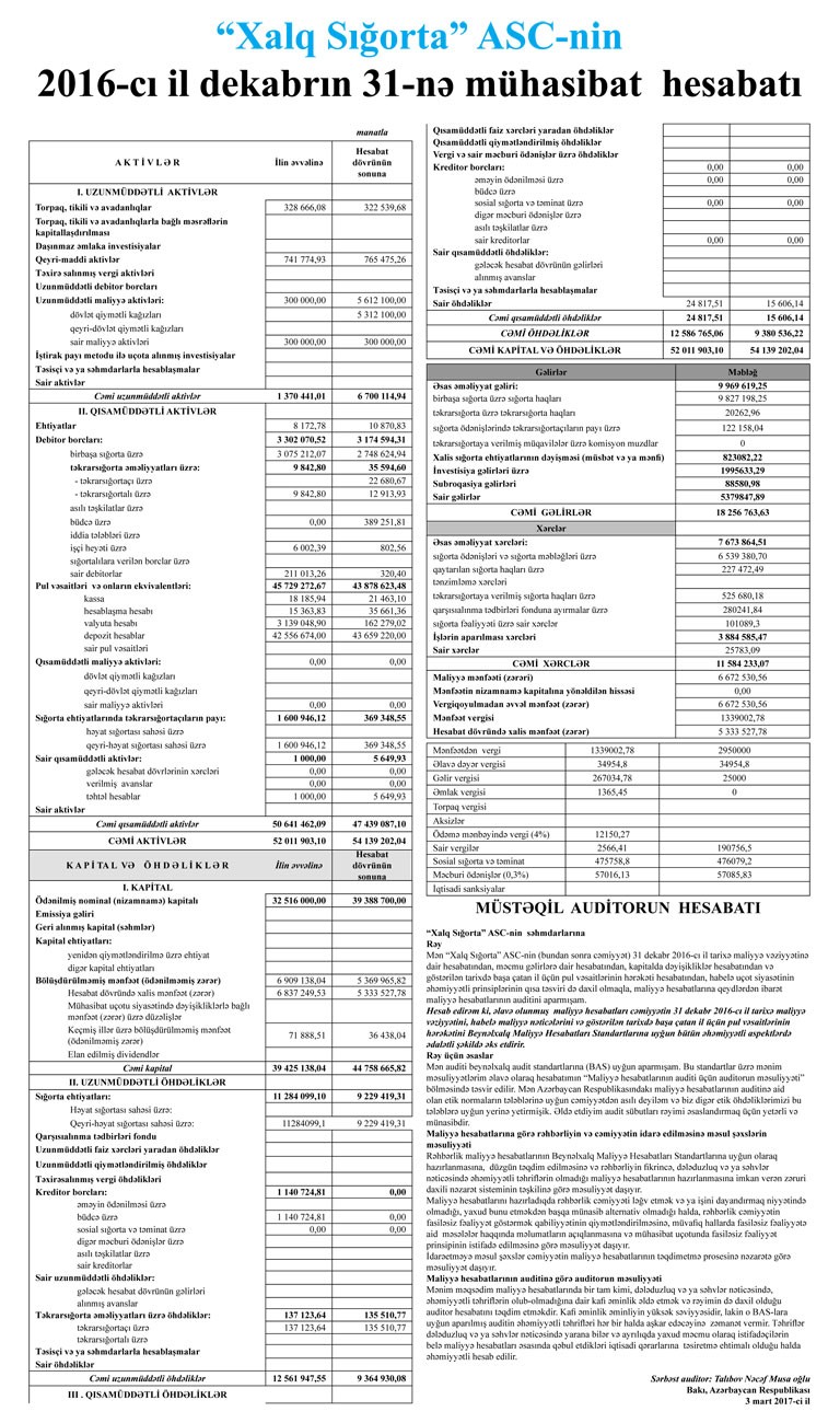 “Xalq Sığorta” ASC 2016-cı ili 5 milyon 333 min manat xalis mənfəət ilə başa vurub. Bu, 2015-ci illə müqayisədə 22% azdır. Belə ki, “Xalq Sığorta” 2015-ci ilin yekunları üzrə 6 milyon 837 min manat xalis mənfəət açıqlamışdı.