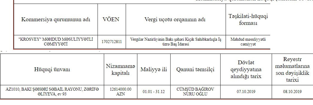 Azərbaycan Vergilər Nazirliyi tərfəindən 12 milyon 614 min manat nizamnamə kapitalı ilə "Krosvey" MMC qeydiyyata alınıb.